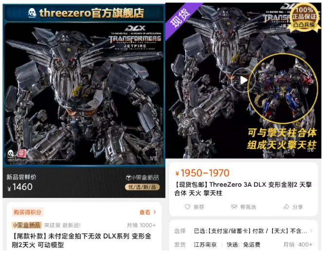 单独看天火,threezero天猫旗舰店的月销量是1000+,放在盲盒榜单中也是可以跻身前十的爆款,而天火的单价1960元是盲盒的数十倍。