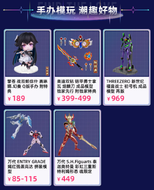 B站会员购4月29日发布的“热爱IP嘉年华”活动,集结了GSC、Banpresto、SSF、世嘉、Furyu、F:NEX等大厂和B站旗下bilibiliGoods、bilipods、BeBox等品牌,其中手办模玩品牌有擎苍、奥迪双钻、threezero和万代。