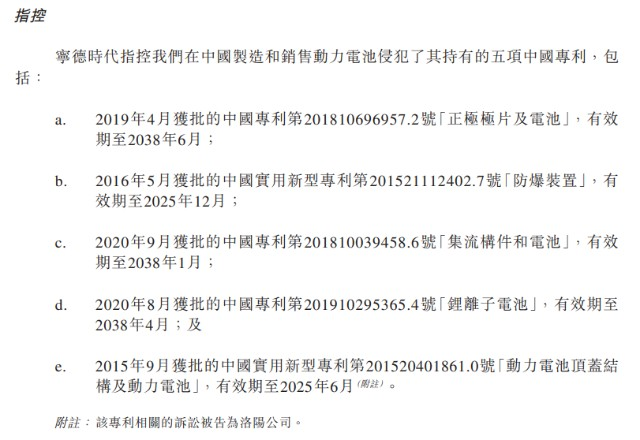 图:宁德时代方面主张的专利权利。来源:公司公告