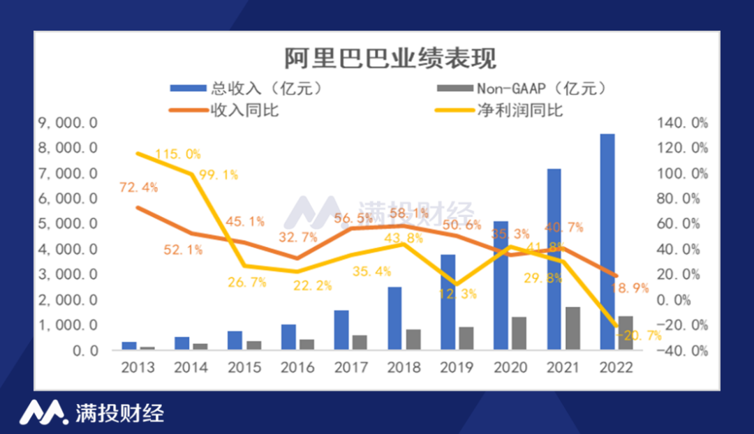 2022财年阿里巴巴集团录得总收入8530.6亿人民币,同比增长18.9%,阿里近十年来的营收规模增长非常迅速,十年间翻了近30倍,随着规模的壮大,集团的收入增速也逐渐放缓。随着放缓的还有净利润的同比,2022财年阿里录得Non-GAAP净利润1363.9亿元,但同比下降了20.7%,这是阿里巴巴Non-GAAP净利润十年来首次录得同比负增长。