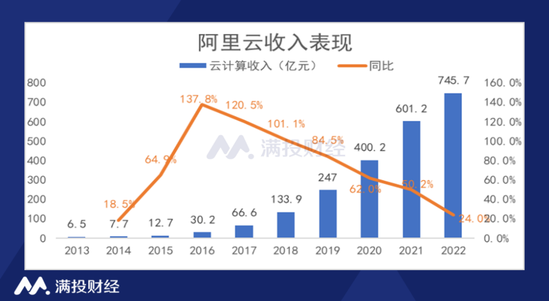 2022财年,阿里云业务实现收入745.7亿元,同比增长24%,虽然收入增速呈下降趋势,但阿里云在经历了12年的发展后,首次实现盈利,也是阿里除中国商务业务外率先实现盈利的业务。2022财年阿里云经调整EBITA(一项非公认会计准则财务指标)由2021财年亏损22.51亿元,扭亏至2022财年的盈利11.46亿元。