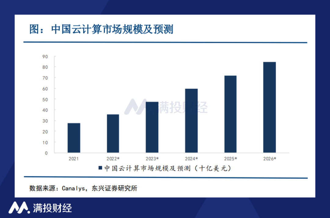 随着数字经济的发展,国家不断出台政策鼓励中小企业上云,工信部提出到2022年底促进10万家中小企业业务上云。同时《“十四五”数字经济发展规划》中提到,到2025年,数字经济迈向全面扩展期,数字经济核心产业增加值占GDP比重达到10%,未来几年或将是中国数字经济基础设施建设的关键时期。Canalys预计,中国云计算市场规模将在2026年达到847亿美元,年均复合增长率有望维持在25%。