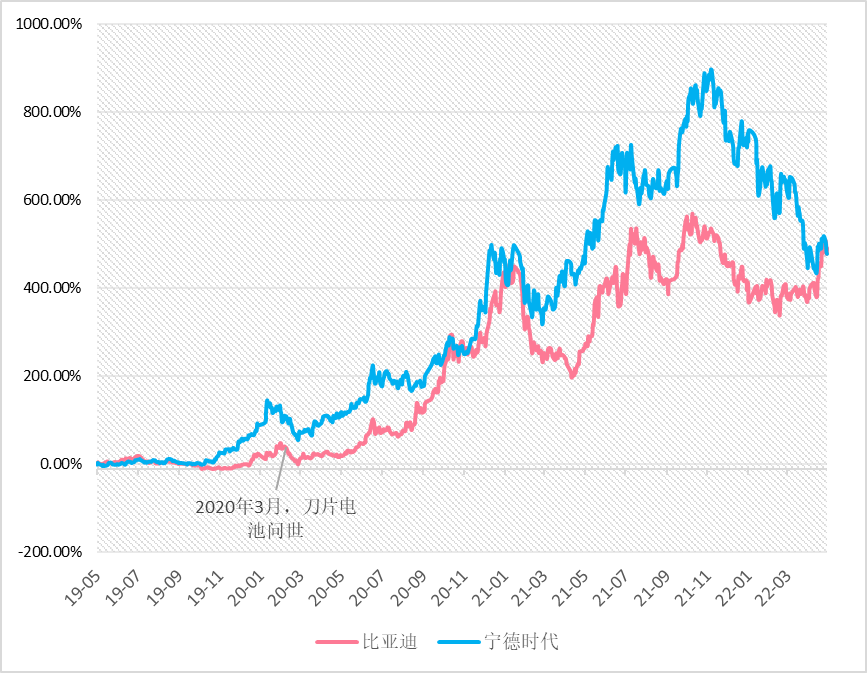 比亚迪与宁德时代近三年股价走势同频波动,来源:Wind,2019.5.27-2022.5.25