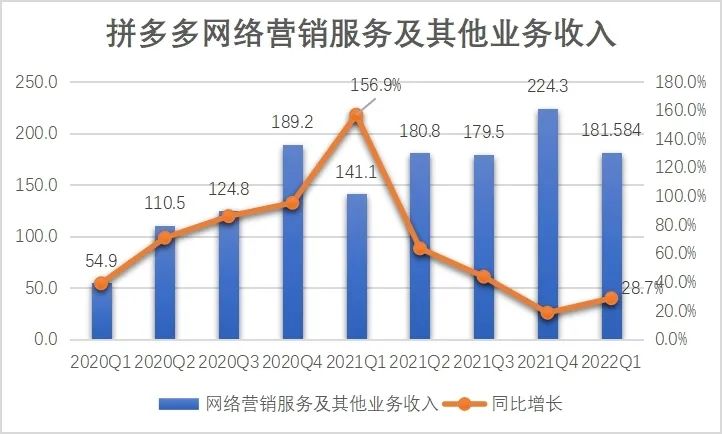 而这一举措也直接使得2021年第一季度拼多多网络营销服务及其他业务收入迎来了同比156.9%的大幅增长。
