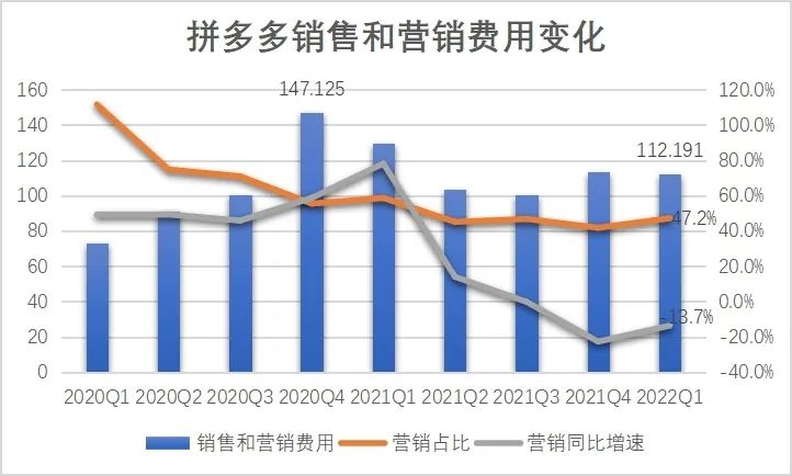 本季度,拼多多销售和营销费用再度减少,为112.191亿元,同比下降14%。
