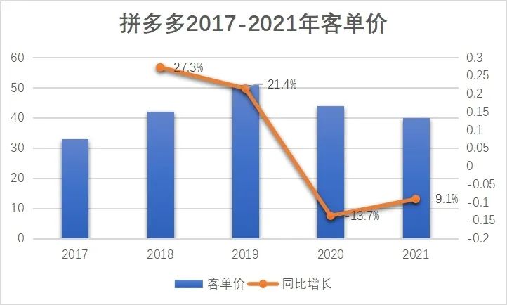 与2020年的44元相比,2021年拼多多AOV下降8%至40元,每位活跃买家的平均订单为70单,相较2020年增长45%。