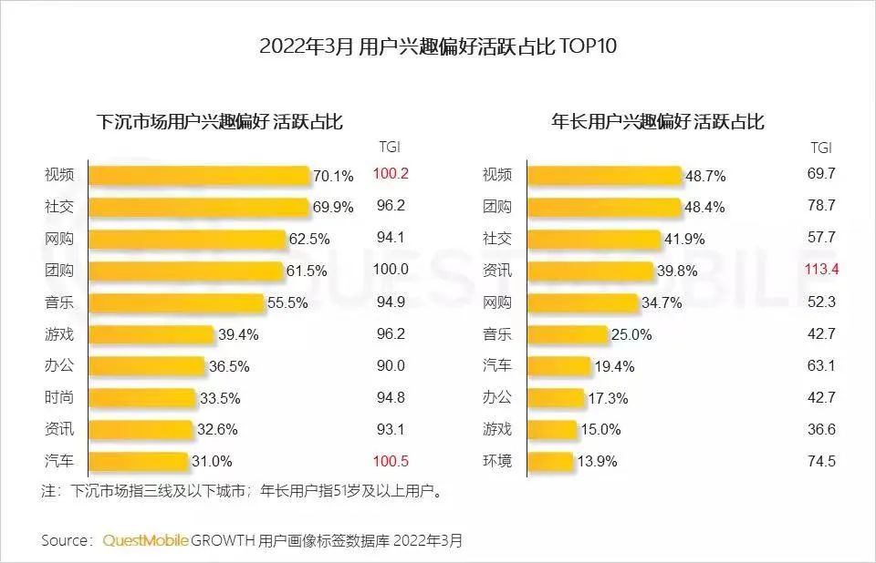 根据QuestMobile的数据显示,下沉及年长用户兴趣偏好活跃排行中,视频都占据了第一的位置。而多多视频从内容到现金营销的模式,实际切入的也正是这群用户。
