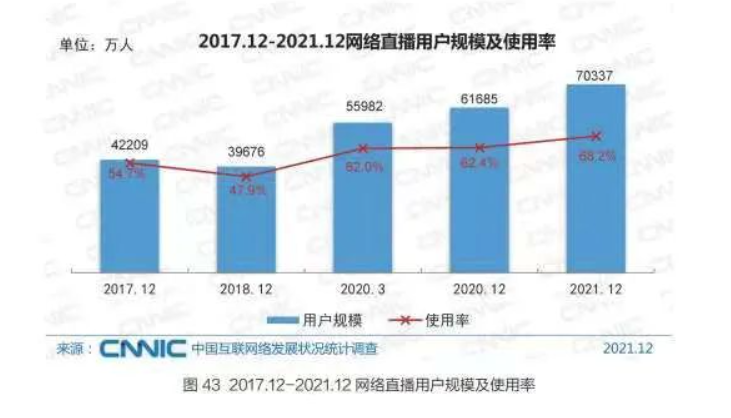 中国互联网络信息中心(CNNIC)发布的第49次《中国互联网络发展状况统计报告》显示,截至2021年12月,我国网民规模达10.32亿,网络直播用户规模和网络音乐用户规模分别达 7.03 亿和7.29 亿,均比去年增长了数千万,占网民整体的 68.2%和 70.7%。其中,演唱会直播的用户规模为 1.42 亿,较 2020 年 12 月增长 476 万,占网民整体的 13.8%。如此庞大的用户基数为线上演唱会的兴起提供了现实可能。