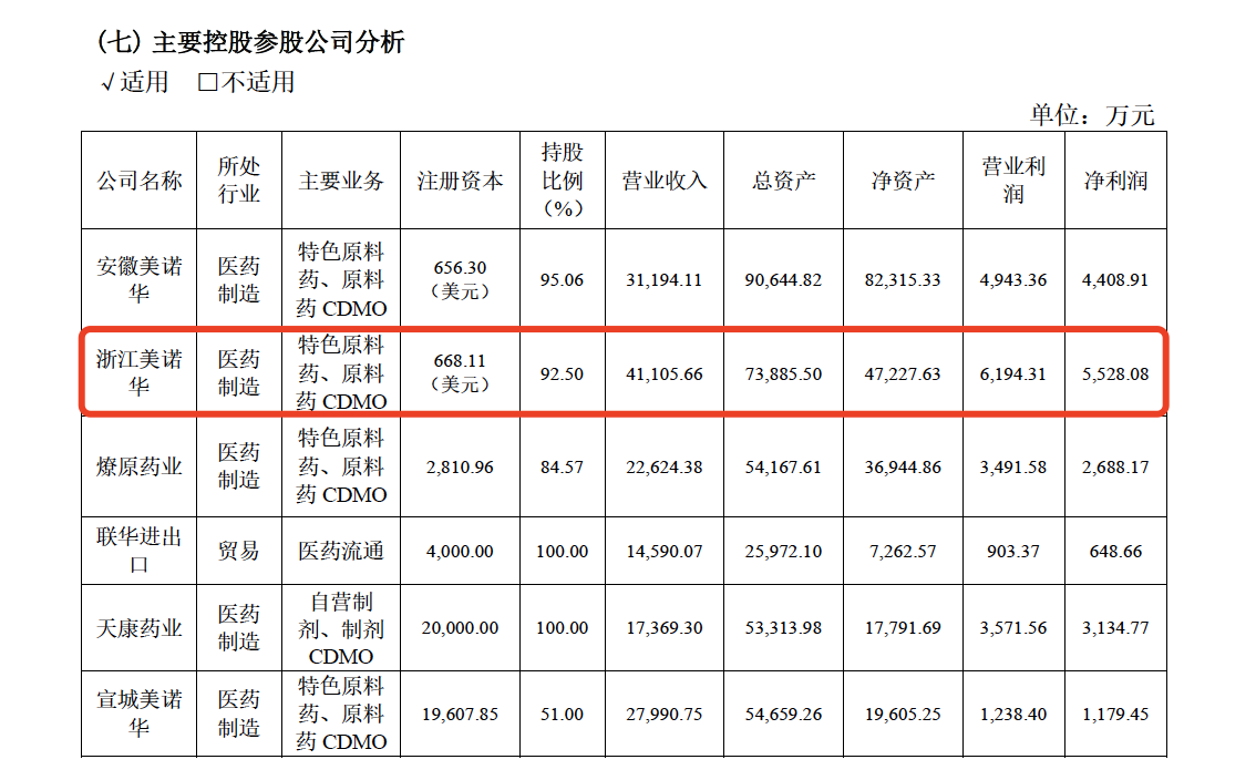 年报还显示,浙江美诺华“年产520吨医药原料药”一期项目正在进行,预计投入3.5亿元,目前已累计投入1.46亿元,项目全部投产后年营业收入约6亿元。