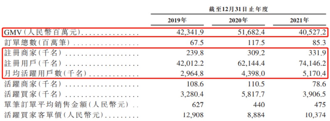 此外,从注册商家、用户以及月均活跃用户的数量来看。2019年至2021年,注册商家由23.98万增长至33.19万,涨幅38.4%;注册用户由4201.2万人增长至7414.6万人,涨幅高达76.5%;而月均活跃用户数则由296.48万名增长至517.04万名,涨幅达42.7%。