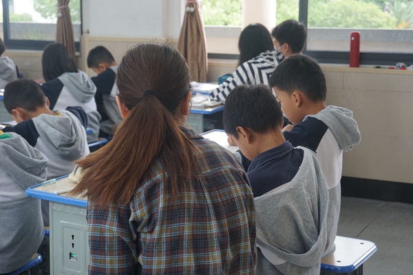 这是浙江省诸暨市詹家山路天马小学一个普通的早上,天空飘着濛濛细雨,8:18学生们已经到班级里开始准备上课了,而半融合班的石一轶老师还等在校门口,她的学生小胖(化名)迟到了,和其老师不一样,等不到学生她不能自己先进到教室,终于她接到了在妈妈陪伴下珊珊来迟的小胖。石一轶是天马小学半融合班的影子老师,26岁的她毕业于湖北师范大学汉语国际教育专业。所谓影子老师,顾名思义,就是如影随形地跟着她的学生。早上接进来的小胖,就是她带的孩子当中的一个。