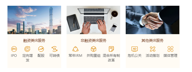 自成立以来,高鹏股份始终秉持“帮助企业提炼资本品牌价值”的核心服务目标,目前累计服务400余家优秀拟上市和上市公司,现参股三只基金,拥有金融SaaS系统(牵牛星Altair)。目前已经形成了相对完整的投资者关系管理业务体系,为客户提供全面IR服务。其中包括融资类IR服务(IPO、定向增发、配股、可转债);非融资类IR服务(常年IRM、并购重组、混合所有制改革);其他类IR服务(危机公关、活动策划、媒体管理)。