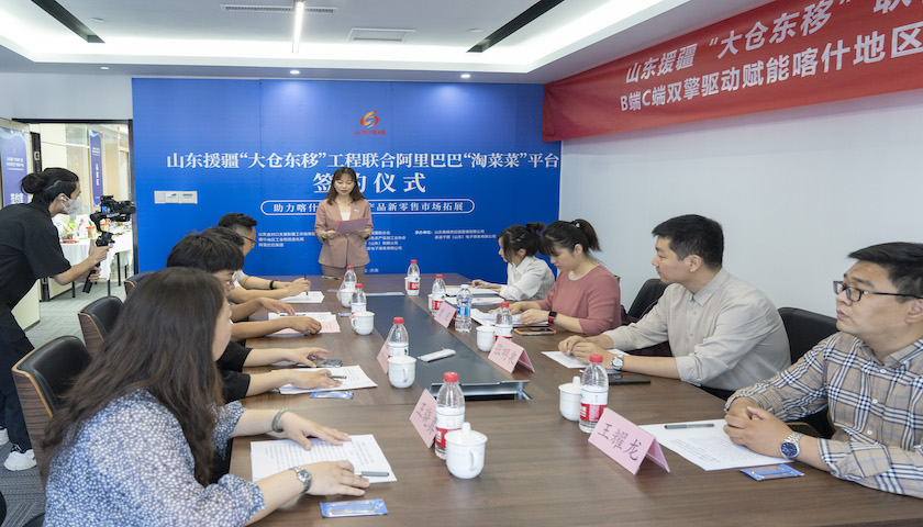 山东省对口支援新疆工作指挥部产业项目组副组长,喀什地区国资委党委委员、副主任董晓波在活动致辞中表示,近年来,山东援疆坚持把企业主体、市场化运作作为助力受援地农产品销售和农牧民增收脱贫的重要抓手,立足喀什地区的资源禀赋,重点培育特色突出、竞争力强的农业产业,提高特色农业的“造血”功能,大力实施“大仓东移”市场援疆工作,助力喀什地区农民增收与乡村振兴。希望在阿里巴巴集团的鼎力支持与帮助下,通过与“淘菜菜”社区团购平台合作,结合“大仓东移”积极构建的喀什特色农产品前置仓储与线下销售网络,实现线上线下“双融合”,编织覆盖全国的喀什农产品数字化流通网,进一步提高喀什地区特色农产品种植、流通和销售各环节的效率,带动实现喀什农产品供应链全链条数字化转型升级。