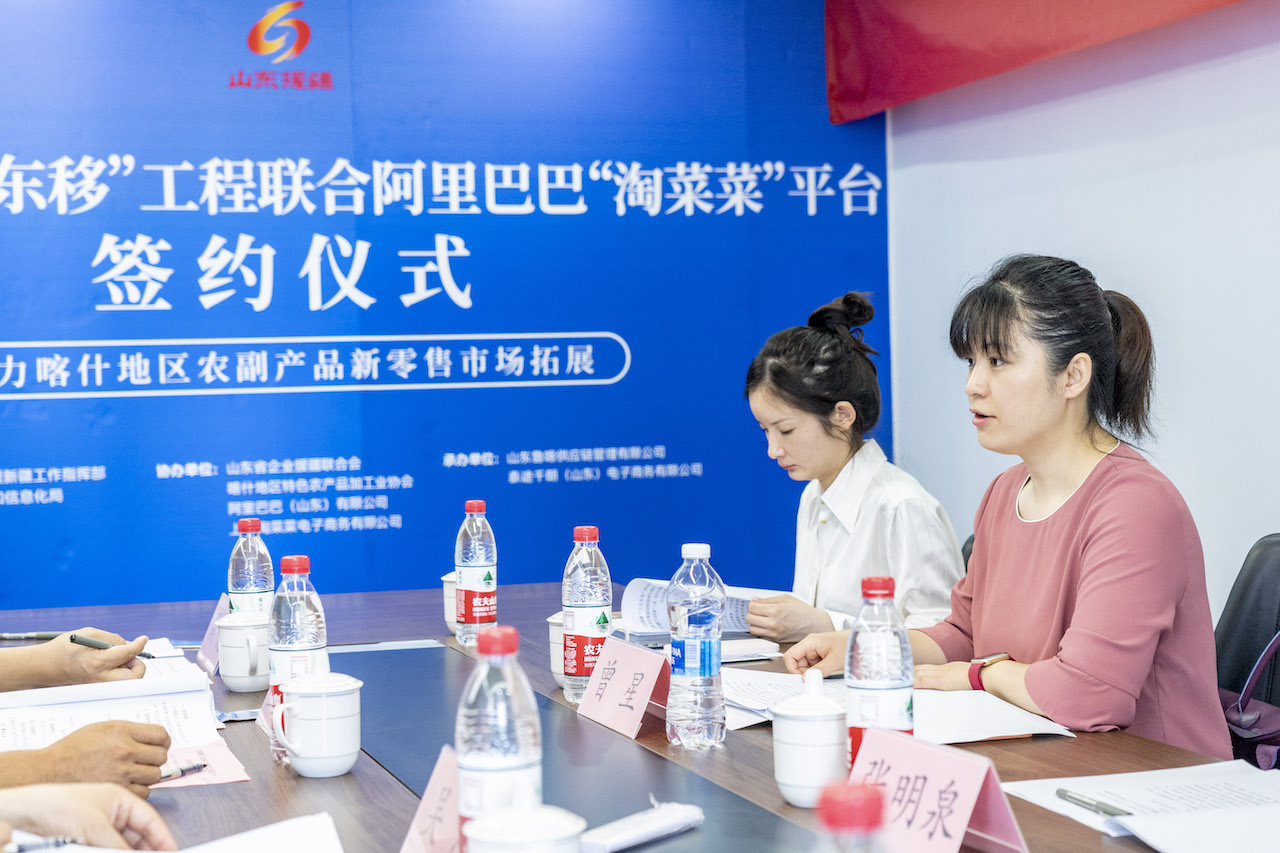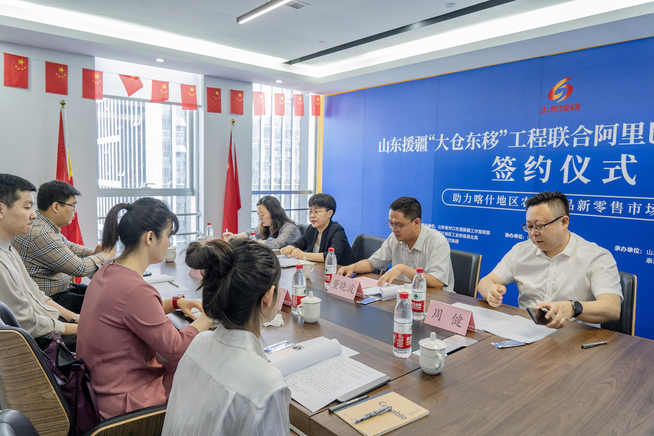 为深入贯彻党中央新时代治疆方略,推动喀什地区提升农副产品加工等特色产业影响力,促进特色农产品销售渠道多元化发展,提高喀什地区电子商务发展水平,助力喀什乡村振兴与产业升级,2022年5月31日,由山东省对口支援新疆工作指挥部、喀什地区工业和信息化局、阿里巴巴集团中国数字商业板块主办,山东省企业援疆联合会、喀什地区特色农产品加工业协会、阿里巴巴(山东)有限公司、上海淘菜菜电子商务有限公司协办,山东鲁喀供应链管理有限公司、泰途千朗(山东)电子商务有限公司具体承办的山东援疆“大仓东移”工程联合阿里巴巴集团“淘菜菜”平台助力喀什地区农副产品新零售市场拓展合作签约活动在济南市高新区汉峪金谷成功举办。此次活动是山东援疆“大仓东移”工程继今年3月份联合1688平台进行喀什地区B2B产业大店共建项目之后与阿里巴巴集团的再度携手,将通过与“淘菜菜”平台合作,助力喀什特色农副产品大力拓展社区电商新零售市场,B端C端双擎驱动,进一步提升喀什特色农副产品整体品牌知名度,有力促进疆外市场销售。山东省对口支援新疆工作指挥部产业项目组副组长、喀什地区国资委党委委员、副主任董晓波,阿里巴巴集团中国数字商业板块华北大区公共事务部负责人曾星,阿里巴巴集团中国数字商业板块山东大区公共事务部负责人张明泉,山东省企业援疆联合会副秘书长、山东鲁喀供应链管理有限公司副总经理吴萍及“大仓东移”项目单位相关负责人、部分喀什农产品生产及经销企业代表出席了现场活动。