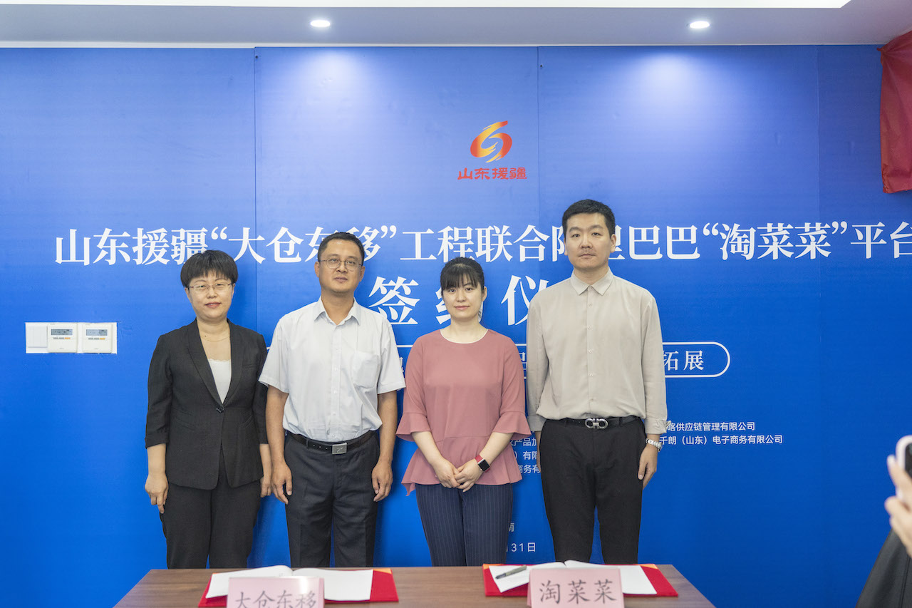 现场举行了“大仓东移”工程与“淘菜菜”平台合作签约仪式,在双方领导见证下,阿里巴巴集团中国数字商业板块山东大区公共事务部负责人张明泉,山东省企业援疆联合会副秘书长、山东鲁喀供应链管理有限公司副总经理吴萍代表双方完成战略合作签约。
