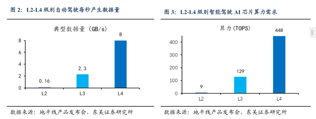 在自动驾驶芯片领域,芯片算力是核心竞争力。自动驾驶级别越高,产生的数据就越多,对芯片的算力要求也就越高。L3级别自动驾驶产生的数据量是2.3GB/s,对算力要求在129TOPS(TOPS,即处理器运算能力单元)以上;L4 级别自动驾驶数据量达到8GB/s,对算力要求达到448TOPS以上,L5级需要超过1000TOPS。也正因为如此,芯片计算力成为各家芯片竞争比拼的核心砝码。