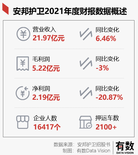 武装押运就是以运钞车为主,安邦护卫的服务是按次收费,无论现金多少。而银行网点每日所需的押运服务次数基本是固定的,因此公司的业务主要和网点数量挂钩。但目前银行网点受到互联网的冲击,规模数量都在不断减小,所以押运行业也受到了一定的冲击,有着夕阳产业的趋势。
