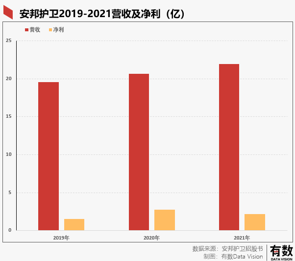 单从收入角度来看,安邦护卫的稳定性极强,2019-2021三年营收分别为19.58亿,20.64亿,21.97亿,净利润为1.6亿,2.8亿,2.2亿,经营几乎没有波动,疫情对其也没什么影响,而且由于行业的特殊性,基本就是躺着数钱的类型。