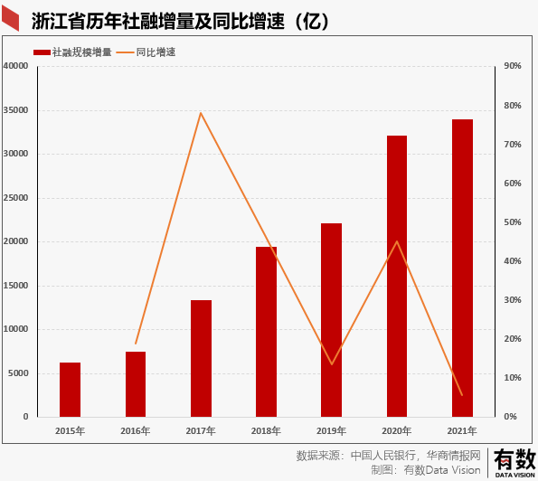 自2017年开始,浙江省的融资规模增速就开始上浮,2017年凤凰行动第一年当年同比增速达到78.09%,几乎实现了翻番,2020年增速维持在50%左右,使得浙江省社融增量首次突破3万亿。而根据投中网的数据显示,2014年浙江省PE/VC投资交易数量仅为84笔,2021年已经飙升至966笔,几乎翻了十倍。