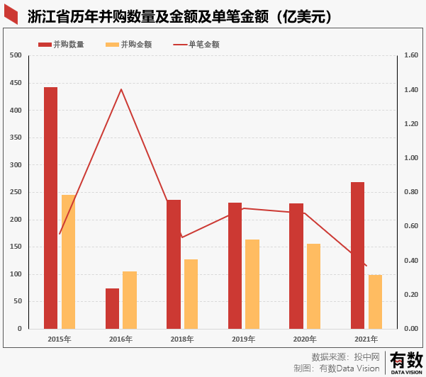 而浙江省2017年之前并购主要以大公司海外并购为主,但凤凰行动之后政府更加重视小公司并购重组达到上市的目的。自2018年开始,虽然并购数量在上升,但总体金额并不高,主要由于并购对象体量不大,更多倾向于小企业合并上市。
