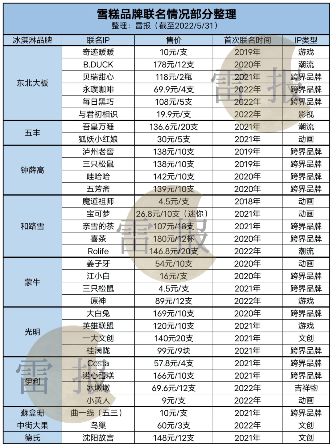 此后,雪糕界的跨界联名产品成为了网红零食打卡必备,在雷报【leinewspaper 】统计的32款IP联名雪糕中,跨界品牌联名达16款,而此类联名雪糕绝大部分折合单价都在10元以上,跨界联名成了雪糕溢价的不二法门。