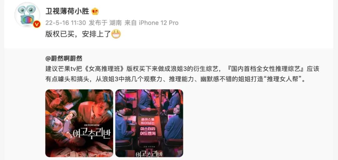 可以看到,今年各平台对推综赛道的发力更为迅猛。腾讯甫一入局,《开始推理吧》后还将奉上《登录圆鱼洲》《他她它侦探社》等多元项目。爱奇艺Q2拿出《萌探探探案2》,预计Q3会上线《奇异局中局》(《奇异剧本鲨》的升级版)。前段时间有媒体透露,芒果已购置高口碑韩综《女高推理班》版权,微博更有民间高人指点,建议其做成《浪姐3》的衍生综艺,但目前看该计划并未被官方采纳。