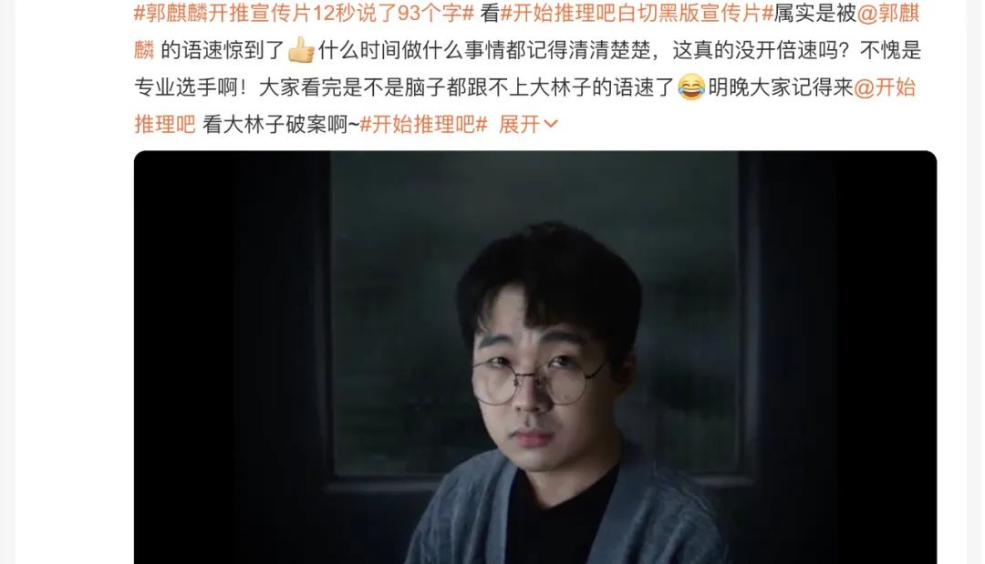 豪华明星卡司,是两档节目率先在社媒上博取关注的关键。《开推》的44秒宣传片为它前期宣发立下大功,浓浓的微恐悬疑气氛下,沈腾化身房屋中介严肃盘问,“推理小说家”郭麒麟12秒说93字,这个双雄对决的先导片一下抓人眼球,也在观众心里种下喜剧咖也能玩推理的颠覆性认知。