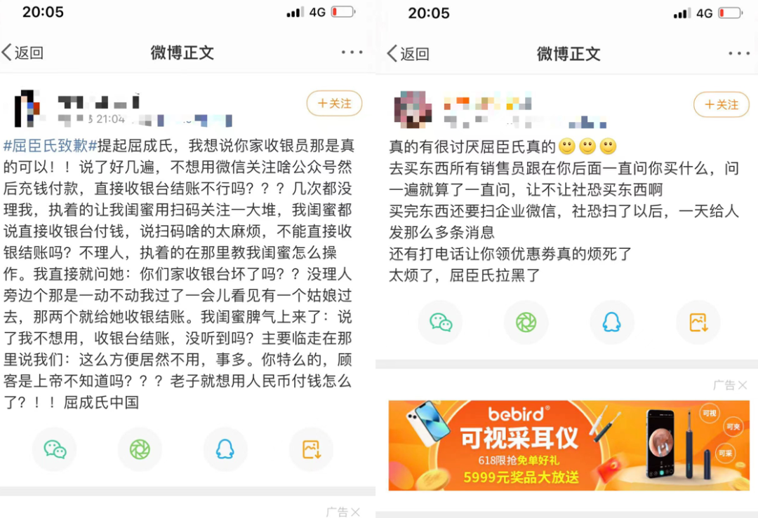 ID名为「从不失格」的微博用户,曾在屈臣氏网店下单自提单,到实体店提货时,却被店员抽走手机悄悄添加了企业微信。