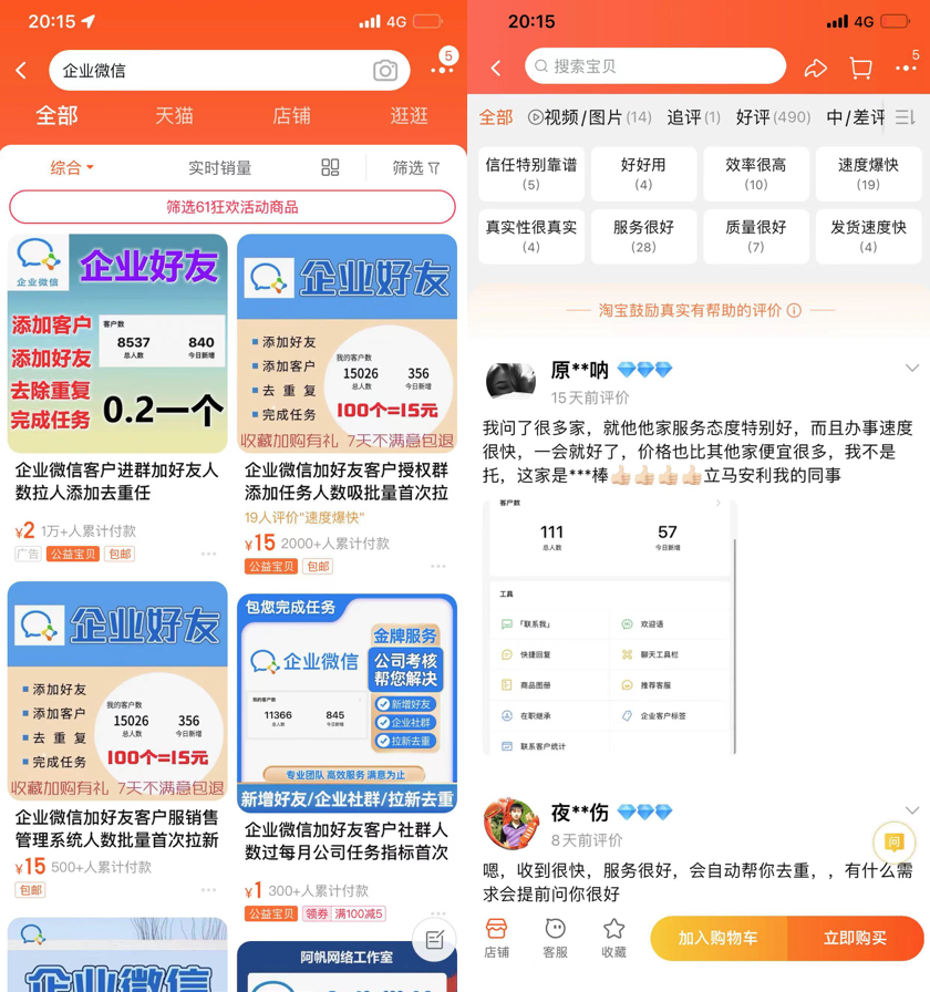 打开淘宝,输入「企业微信」,首先跳出来的就是「加客户任务」服务,在商品链接里,企业微信加好友,有去重和不去重两种,不去重,意思是添加过该品牌其他导购,现在继续添加你,去重,则是首次添加该品牌。