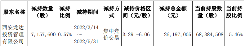 5月31日晚间,广汇物流公告,第三大股东西安龙达投资管理有限公司在3月14日至5月31日期间减持公司股份715.76万股,占公司总股本的0.57%。