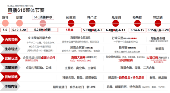 腹背受敌的天猫将本次“618”大促划分为4个阶段:5月26日20:00-5月31日20:00开启预售,5月31日20:00为第一波现货抢购,6月4日0:00为第二波现货抢购,6月15日20:00为第三波现货抢购。