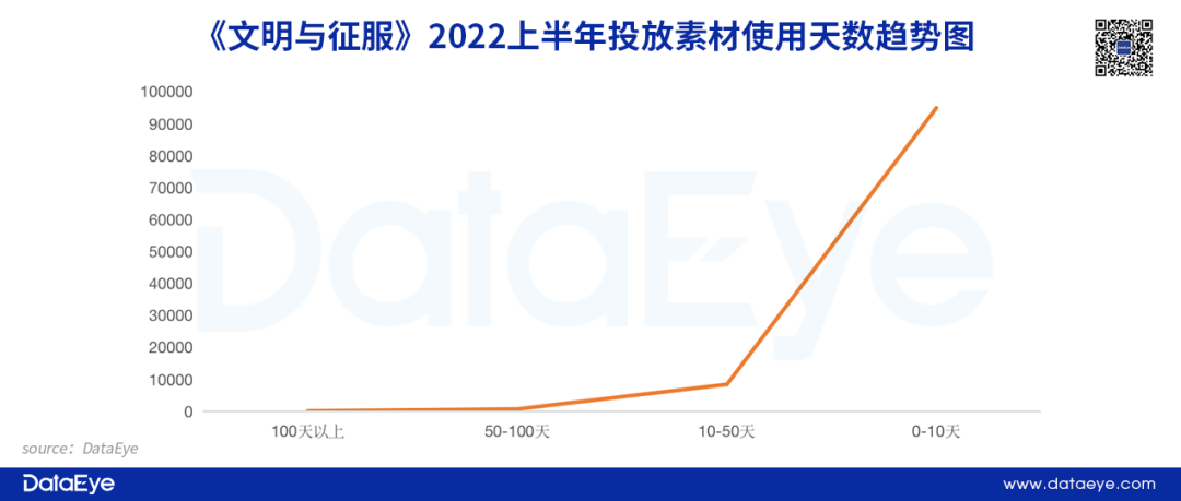 DataEye研究院抽样统计了今年抖音平台新增的广告素材数据(去年投放沿用至今的不算),我们发现:总样本近665万组新素材中,有632万组广告素材的使用天数不到10天,占比95%!而使用天数超过50天的,仅占比0.38%。