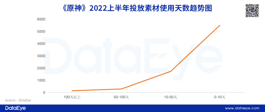 《原神》例外,主要因为ROI不严。《原神》今年投放的新素材中,有超130组使用天数超百天,与其余三款产品形成鲜明对比。《幻塔》也有这个特点。这主要是因为二次元游戏都不依赖买量,对ROI要求并不苛刻。买量广告对他们而言就是一个“轮播的品牌广告播放器”——有量最好,没量就当打品牌广告了。