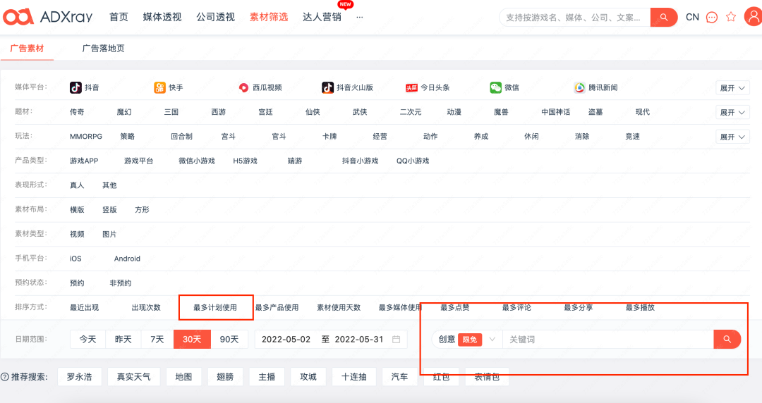 上ADX-素材筛选-创意搜索,搜该热词相关的创意。搜索出结果后,用“最多计划引用”或者“素材使用天数”排名,找高效创意。