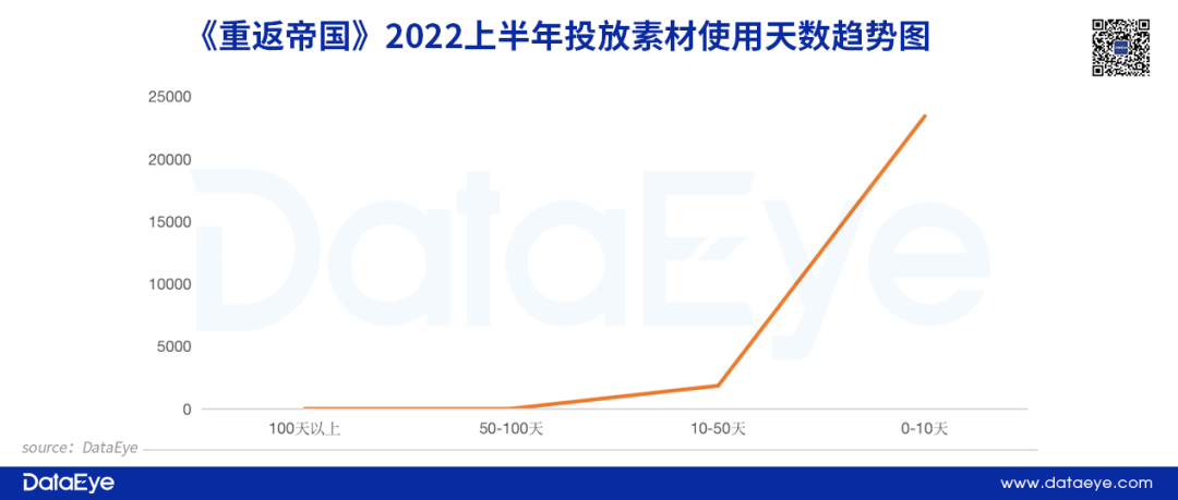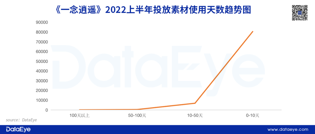 比如,《一念逍遥》,作为买量大户,仅在今年的投放就接近9万组素材,超80%的素材使用天数都为10天以下。《一念逍遥》走的就是广撒网、重复剪辑的路线,通过持续的曝光率,在用户群中形成积累印象——这是典型的大厂打法,小厂难以效仿。