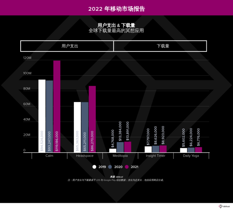 由于疫情的影响,大量健身房关闭,这几年健康和健身应用程序出现安装量激增。根据data.ai的《2022年移动市场报告》显示,2019年健身与健康APP总下载量为19.7亿次;到了2021年,这一数字达到了24.8亿。