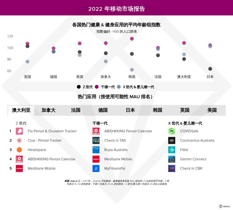 值得一提的是,在不同国家,千禧一代都比其他年龄段对健康和健身App的下载量更高。此外,在应用产品选择方面,X世代和婴儿潮一代显示出对自我量化App的偏好,更偏向于计步器、减肥、步行和远足App的下载。未来如果想要在这条赛道上博得头筹,还需考虑用户的年龄需求及偏好。