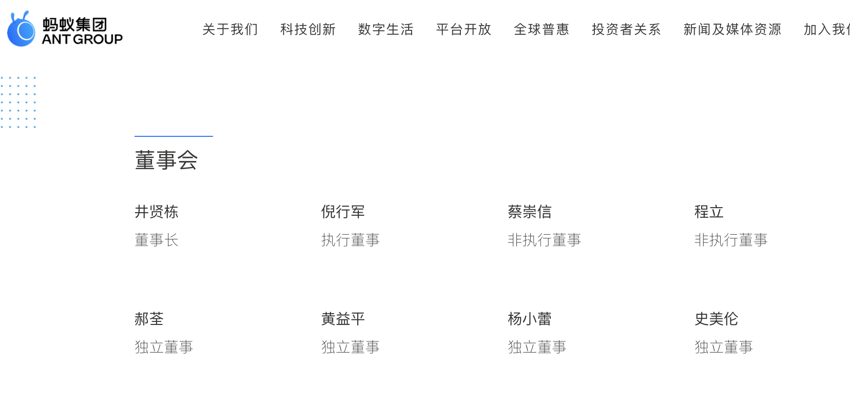 此次调整后,蚂蚁集团董事会呈“2+2+4”结构:两名执行董事,分别为井贤栋(董事长)、倪行军;两名非执行董事/股东代表董事,分别为蔡崇信、程立;四名独立董事,分别为郝荃、黄益平、杨小蕾、史美伦。
