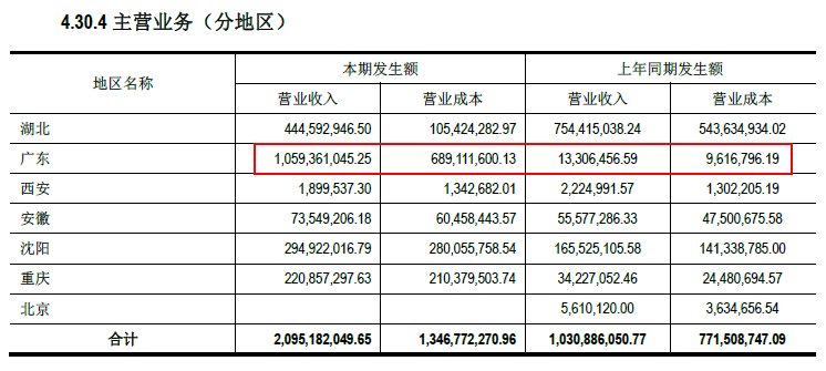 由分地区主营业务表可见,广东地区营业收入由2015年上半年的0.13亿元上升至今年的10.59亿元。即东莞名流置业所带来的销售增长。