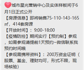 据最新消息,仁恒城市星光营销中心以及实体样板间今天正式对外公开,参观需提前预约,并且需要验资200万(股票、基金、理财均可,形式不限,现场核验)。