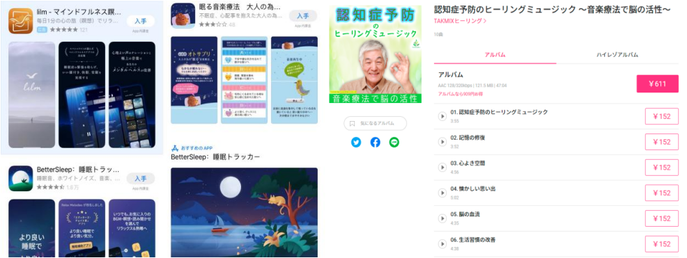 日本的音乐治疗app主要集中于睡眠治疗和冥想,在认知症音乐治疗app方面,大多处于音乐库(治疗音频、老歌收集)整理阶段。