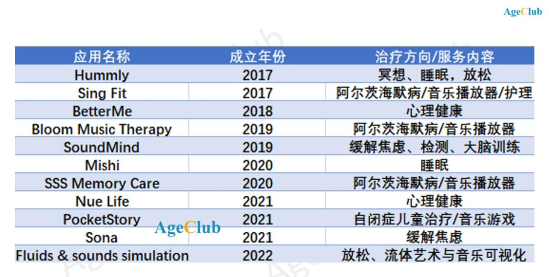 美国音乐治疗创新种类多,以缓解焦虑、睡眠为主,阿尔茨海默病治疗较少,核心技术以回忆疗法为主。据AgeClub不完全统计,由美国自主研发,且可在苹果应用商店下载的app如下: