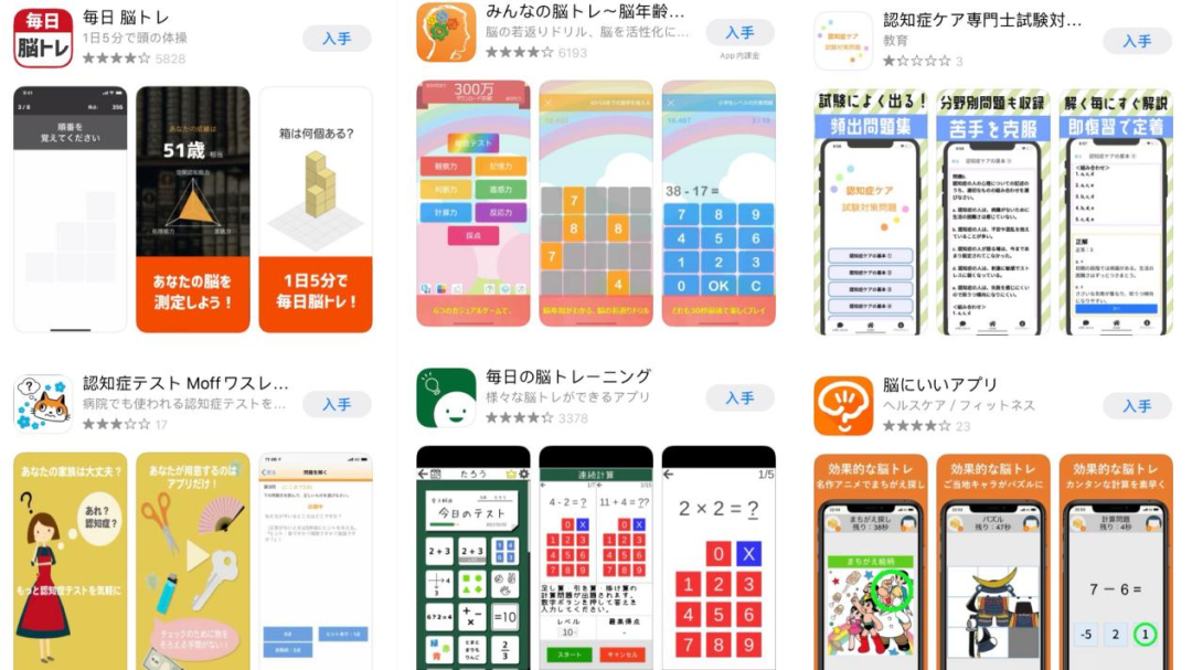 日本也有许多关于认知症干预的app,在苹果应用商店可下载一些预防认知症的小游戏,主要以数字游戏为主。也有认知症教育app,人们可以搜索在不同场景下对认知症人群的帮助或者进行答疑。