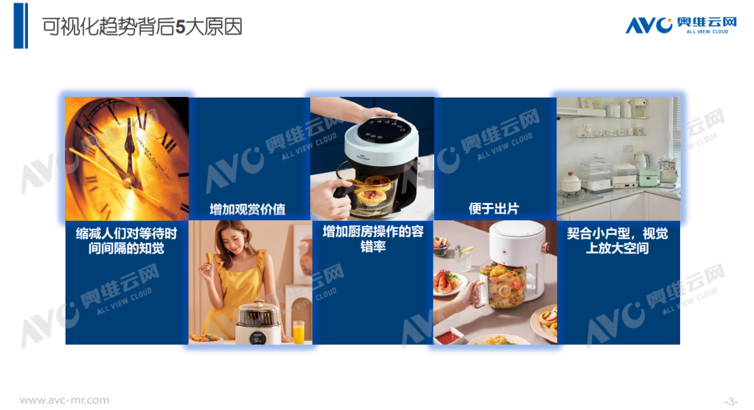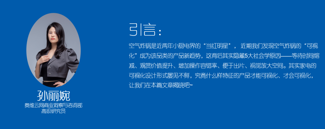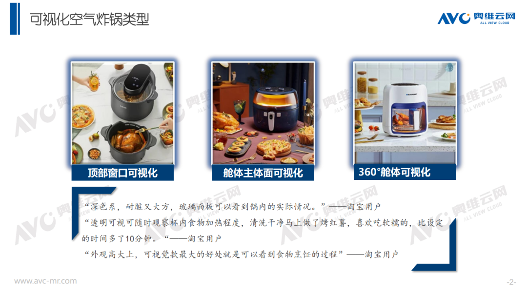 虽然可视化空气炸锅诞生时间不长,但产品可视化已经演变出多种形态——顶部窗口可视化、舱体主体面可视化、360°舱体可视化,这也恰恰体现了可视化空气炸锅市场的繁荣现状。