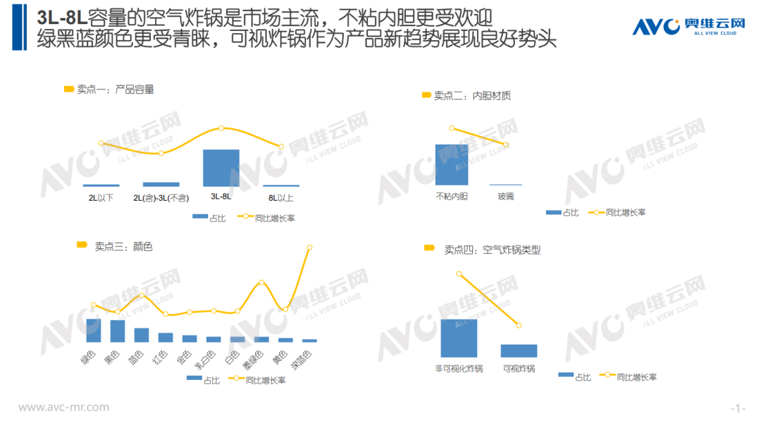 产品可视化:除去常规的容量、颜色、材质,我们欣然发现虽然非可视化目前仍是主流但可视化空气炸锅已悄然崛起,可视化空气炸锅市占率接近30%,同比增长率也超过30%。