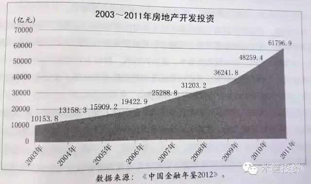 从2003年开始,我们的房地产开发投资额逐年增加,从2003年的1万亿到2011年的6万多亿。全中国的资金都开始涌向房地产,开发商与购房者一起拿钱玩了10年的狂欢盛宴、皆大欢喜!