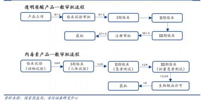 二是行业壁垒较高。这个壁垒一是技术壁垒,像华熙生物微生物发酵法在行业内独一无二;二是拿证壁垒,玻尿酸的拿证刚性审批周期平均3-4年,而肉毒素刚性审批周期平均达8年。