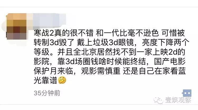 一个并无必要且效果糟糕的制作环节(3D转制),一个观众怨声载道却必须忍受的放映版本,如此拧巴的市场选择也折射了中国电影市场发展背后的隐疾。今年中国电影市场增速的下降出乎很多人意料,对于国产电影及影院来说,在狂奔的票房梦之前,持续地让观众失望、遗憾、抱怨只会最终令观众远离影院,前期的那些高票房最终会令市场看到竭泽而渔的恶果。而对于很多一边骂着国产片又一边习惯看盗版的“观众”来说,也需要明白,电影行业的良性发展不只是企业的责任,需求正是供给的原因,观众也在塑造这个市场,甚至决定这个市场的未来。