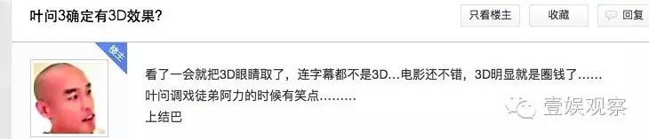 《寒战2》并非孤例,《澳门风云3》、《叶问3》等影片以剧情片为主要特征,就视觉而言,3D版实在难言必要,观众对此亦有不少抱怨。在豆瓣上,有网友吐槽《寒战2》“警匪片非做成3D圈钱,毫无诚意”、“请问这部电影,哪一帧3D了?”,《澳门风云3》也招至豆瓣网友“5毛特效”的吐槽,而同样有网友评论《叶问3》“没有3D的必要”。