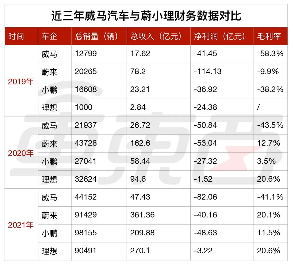 IPO文件显示,在刚过去的2021年,威马汽车一共售出了44152辆新车,总收入为47.43亿元,2019年、2020年、2021年三年的总收入为91.77亿元;去年全年的净亏损则为82.06亿元,三年累计净亏损额约为174.35亿元。